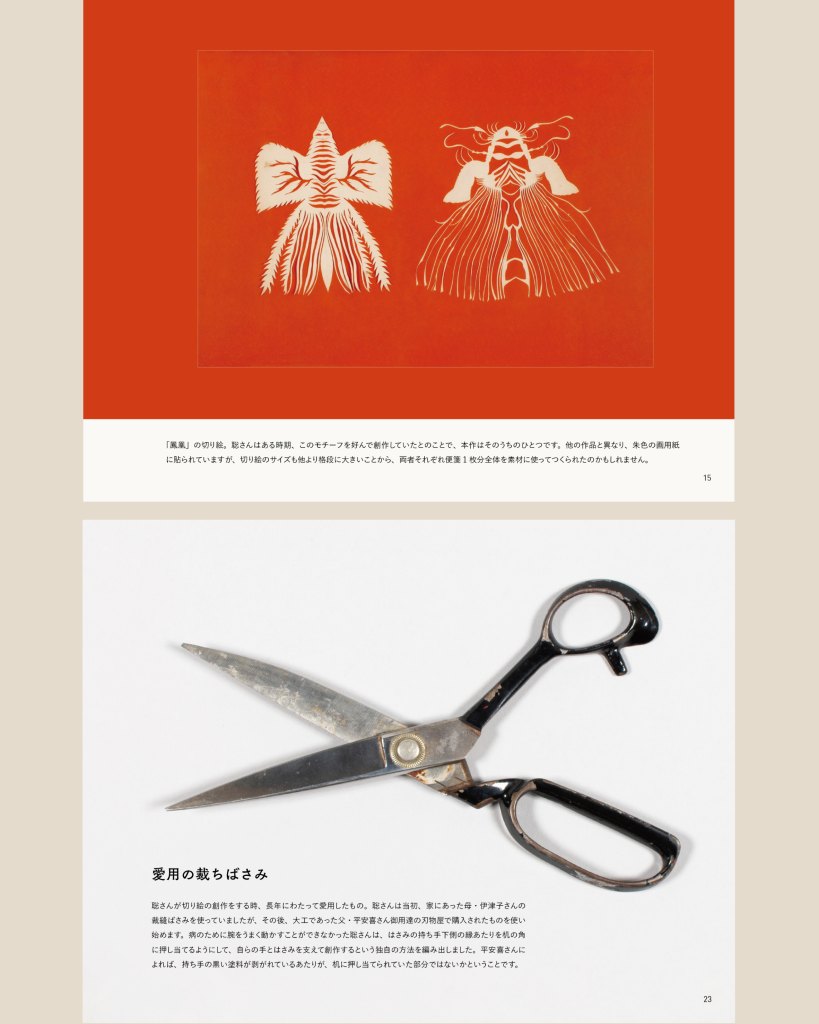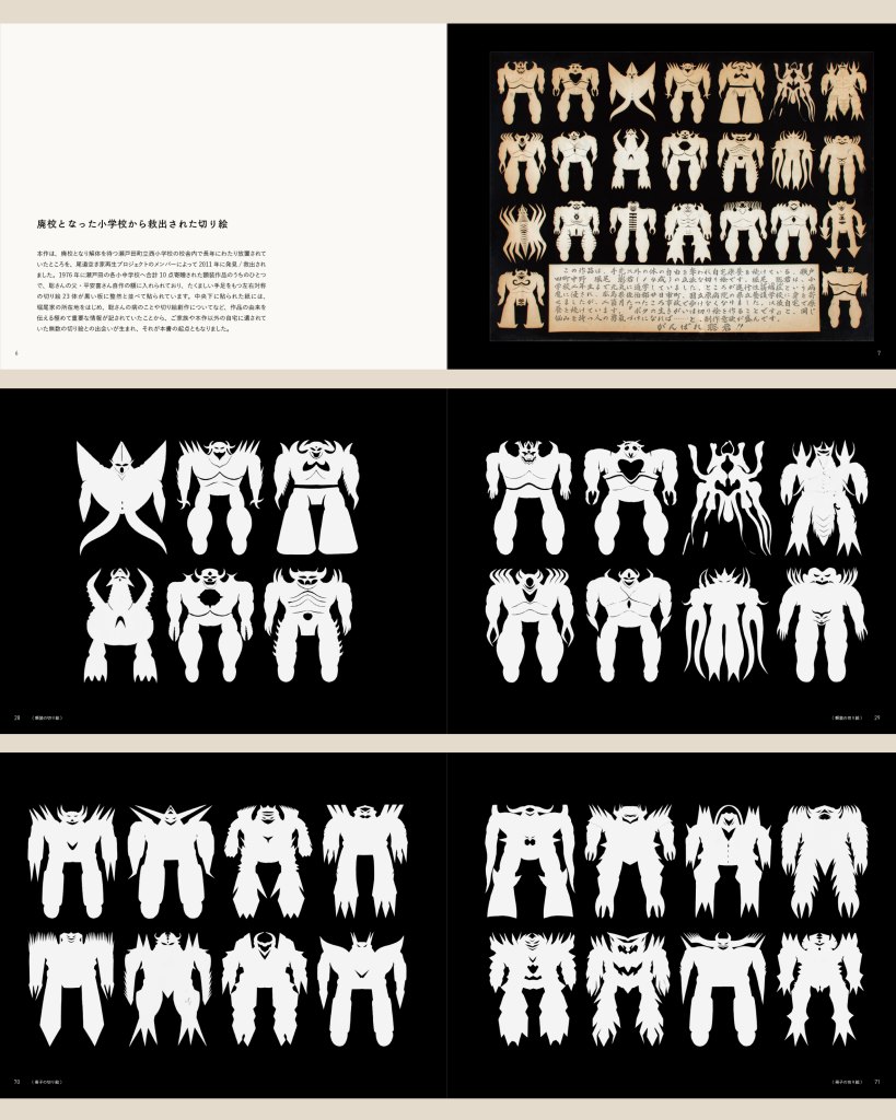 本書には、同展覧会への参加や本書発行の起点となった額装作品をはじめ、自宅に遺されていた無数の切り絵やいくつかの特注品、愛用のはさみなど様々な資料のほか、父・平安喜さんへの聞き取りも掲載。本書に登場する切り絵の総体/種類は、現存が確認されている作品のほぼ全点となる役560体!で、聡さんがつくりだした独自の怪獣やロボットや動物や生命体の切り絵が図鑑のようにずらりと姿を現す内容となりました。